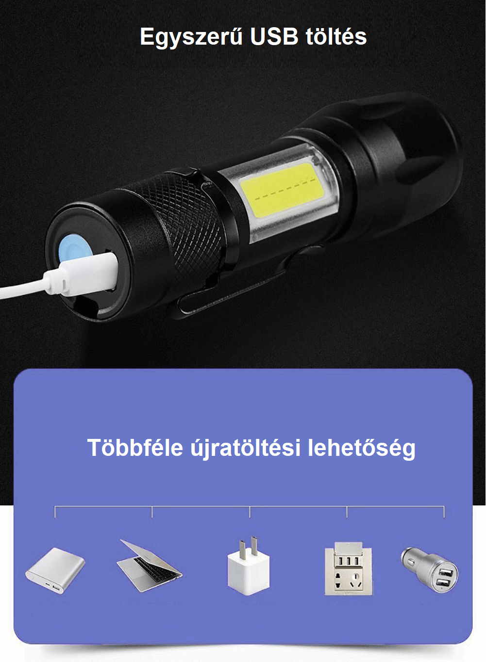 A kütyü maximális fénykibocsájtása elérheti akár a 2000 Lumen-t is, ami méretéhez képest hatalmas teljesítmény. Újratölthető 400 mAh-s akkumulátorral rendelkezik, amelyet USB-vel lehet feltölteni. A termék fókusza állítható, így nagyobb szögben, de szórtan, vagy messzebb, de keskeny fénnyel tudod megvilágítani a kívánt látnivalót. Ergonomikus kialakítása és csúszásgátló gumi fogantyúja biztos fogást nyújt használat közben. Kompakt, mini mérete által és a rajta található klip segítségével könnyedén tudod magaddal hordani túrára, kempingre, biciklizésre, vagy akár munkára.