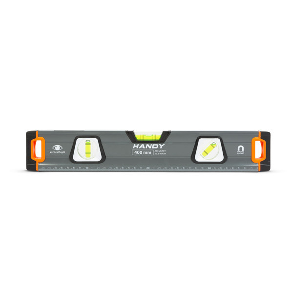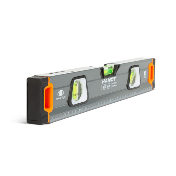 Professzionális vízmérték 3 db elektronikusan kalibrált libellával. Minőségi, nagy szilárdságú festett alumínium boxból készült, amelynek a végén stabil gumi végütköző található.
