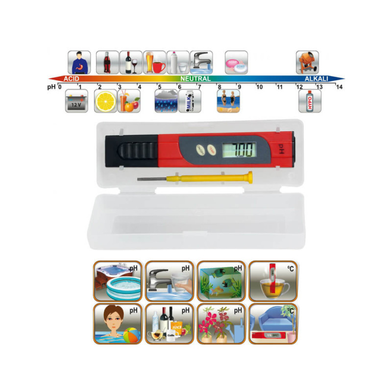 Ez a PH mérő műszer a papírcsíkokkal ellentétben, nagyon könnyen használható és pontos azonnali eredményt mutat. Ez a készülék egy digitális kijelzőn mutatja ki, hogy az adott anyag mekkora PH értékben tartalmaz savat vagy lúgot, továbbá alkalmas a folyadék illetve a levegő hőmérsékletének a mérésére is. Ideális Medencékhez, akváriumokhoz, laboratóriumoknak és még rengeteg helyre.