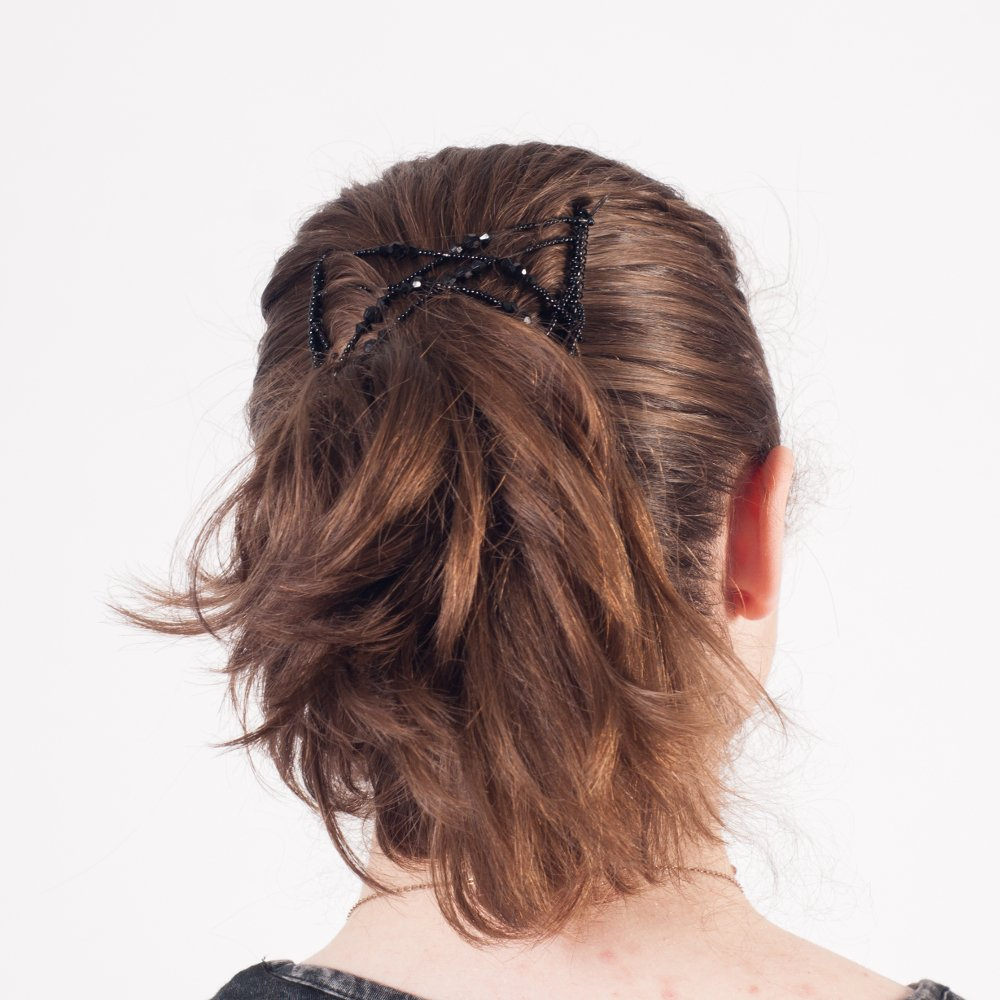A csat segítségével lófarokba is felkötheted a hajadat, hajgumi nélkül. Egyszerűen fogd össze a hajad, húzd át a gyöngyök között, majd rögzítsd. Ha túl lazának érzed, tekerj rajta egy-két csavarást, hogy szorosabb legyen.