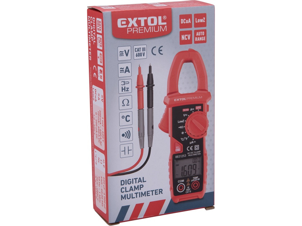 EXTOL PREMIUM lakatfogó és digitális multiméter; Amper/Volt/Ohm mérő, hangjelző funkcióval, CE, 2 db 1,5V AAA elem
